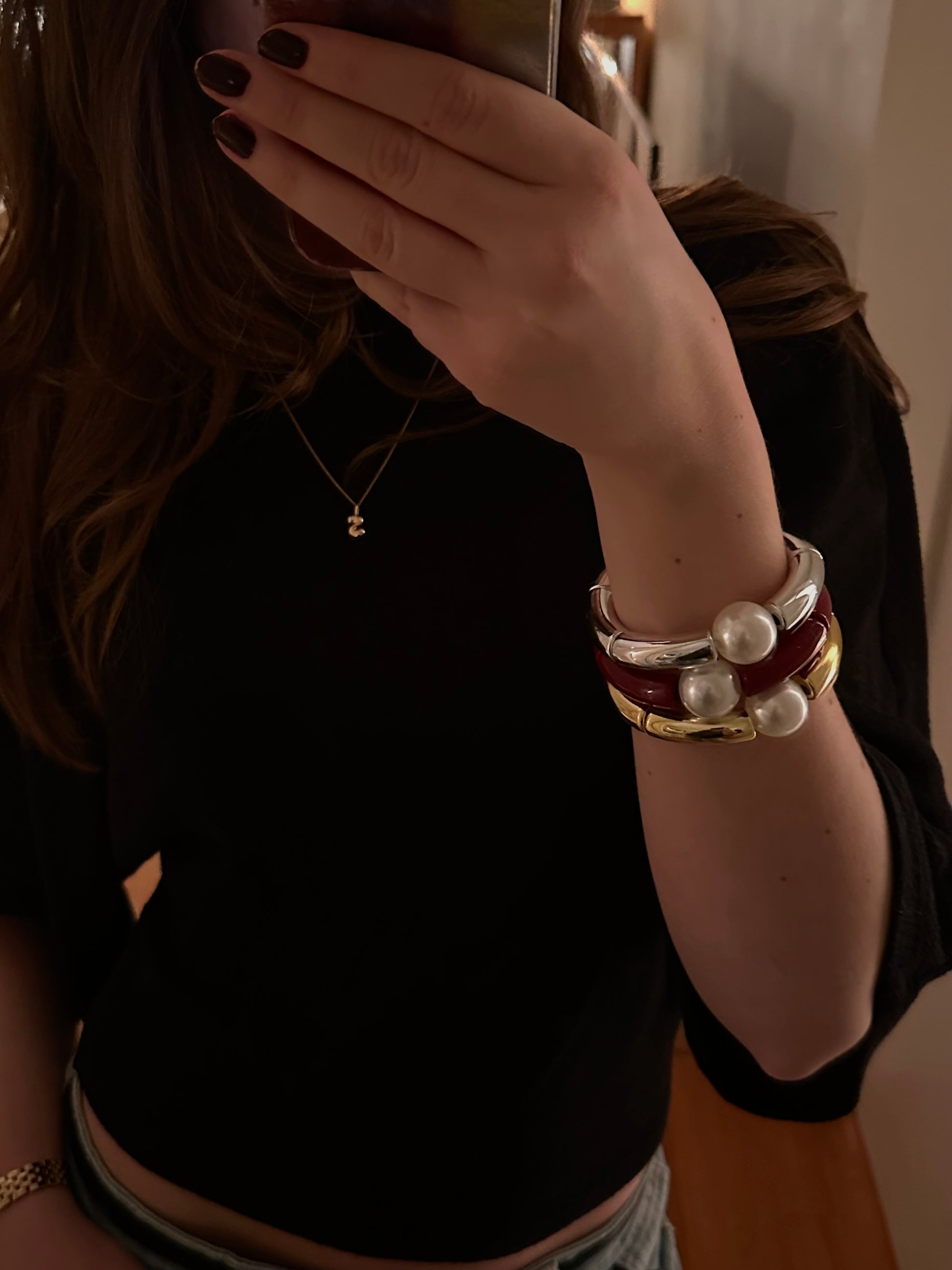 Vårt senaste tillskott - serien HOLIDAY. Vårt originalarmband med en glimrande twist, en pärlemorpärla adderad. På grund av pärlan blir armbandet därför något större än originalserien, så det hänger lite mer på armen. Väldigt fina att kombinera med övriga favoritarmband, och en självklar accessoar till jul och nyår!